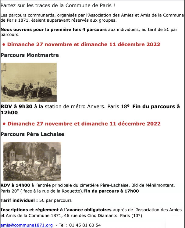 Inscriptions et réglement à l’avance obligatoires auprès de l’Association des Amies et Amis de la Commune 1871, 46 rue des Cinq Diamants. Paris (13e)
